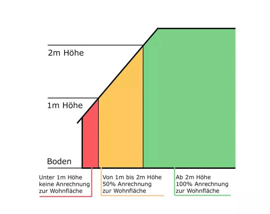 Für die Berechnung der Wohnfläche spielt vor allem die Raumhöhe eine entscheidende Rolle. Bei Dachgeschosswohnungen dürfen Flächen unter Schrägen bis zu einem Meter Raumhöhe zur Wohnfläche gar nicht angerechnet werden. Fläche unterhalb einer Schräge von einem Meter bis zu zwei Metern können nur zur Hälfte gerechnet werden. Das Gleiche gilt für Räume, die wenige als zwei Meter hoch sind, wie zum Beispiel Dachkammern. Räume und Raumteile, die eine Höhe von mindestens zwei Meter und mehr ausweisen, werden zur Wohnfläche voll angerechnet werden. Wenn sich innerhalb der Wohnung Treppen befinden, werden Flächen unterhalb von Treppen nach dem gleichen Prinzip berechnet, wie bei Schrägen.